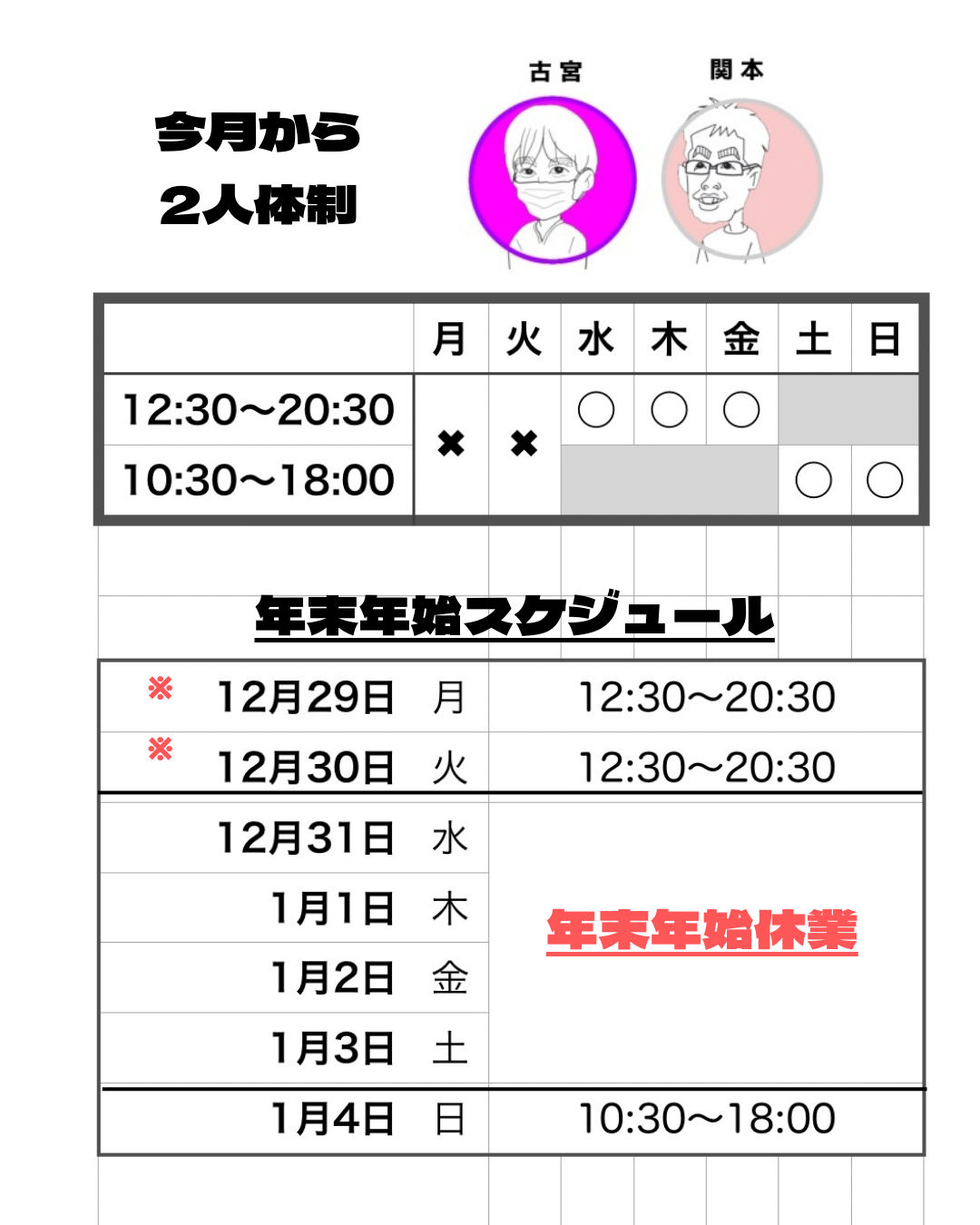 当面の間、古宮・関本の二人体制となります。